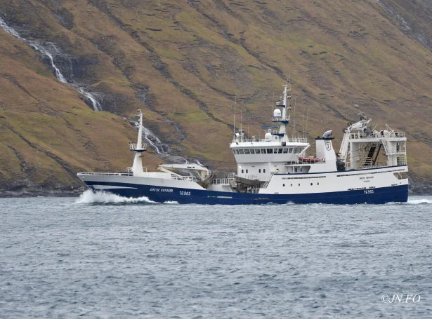 Arctic Voyagar, sum hevur verið á svartkjaftaveiðu í føroyskum sjógvi, kemur fyrrapartin á Fuglafjørð.