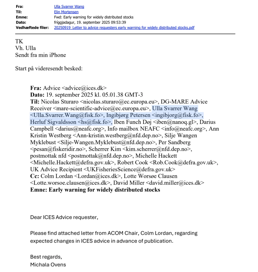 Klokkan 09:53 tann 19. septembur sendir Ulla Svarrer Wang teldupostin víðari til Elin Mortensen, sum er aðalstjóri í Fiskimálaráðnum.