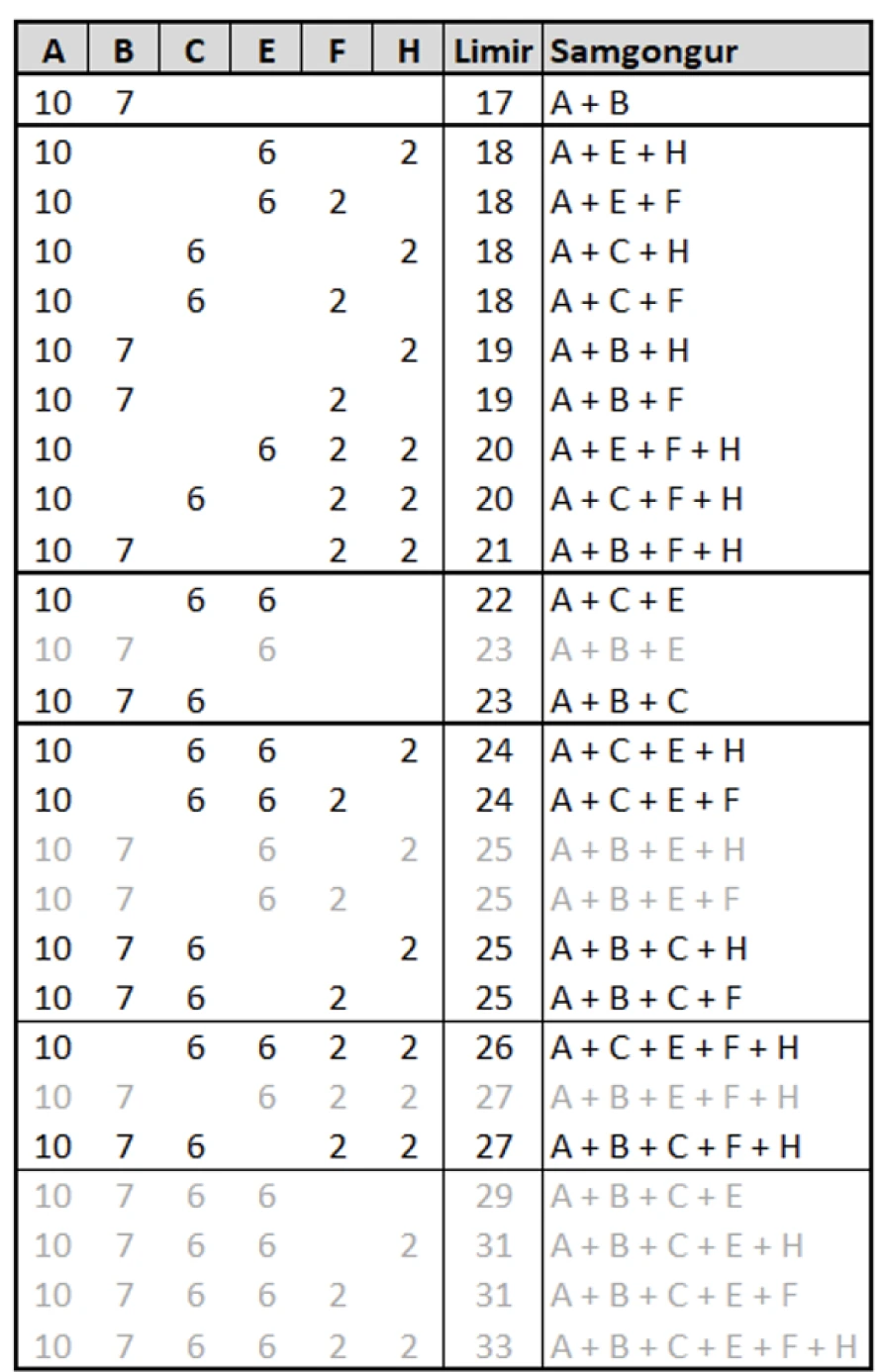 Matematisku møguleikarnir at skipa samgongu eru framvegis teir somu, íalt 32 samgongur við 17 tinglimum. Onkrar smærri broytingar eru í onkrum samansetingum, men yvirskipaða myndin er tann sama. Fólkaflokkurin hevur buktina og báðar endarnar.