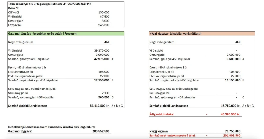 Greiðar útrokningar vísa, at lógarbroytingin fer at kosta landskassanum umleið 40 mió. krónur um árið. Orsøkin er einføld. Ein stórur partur av brúktu leigubilunum fer at verða seldur úr Føroyum, heldur enn til føroyskar keyparar.