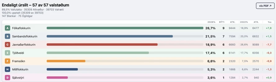 Fólkaflokkurin fekk 26,7 av atkvøðunum, og gevur tað 9 tingfólk.