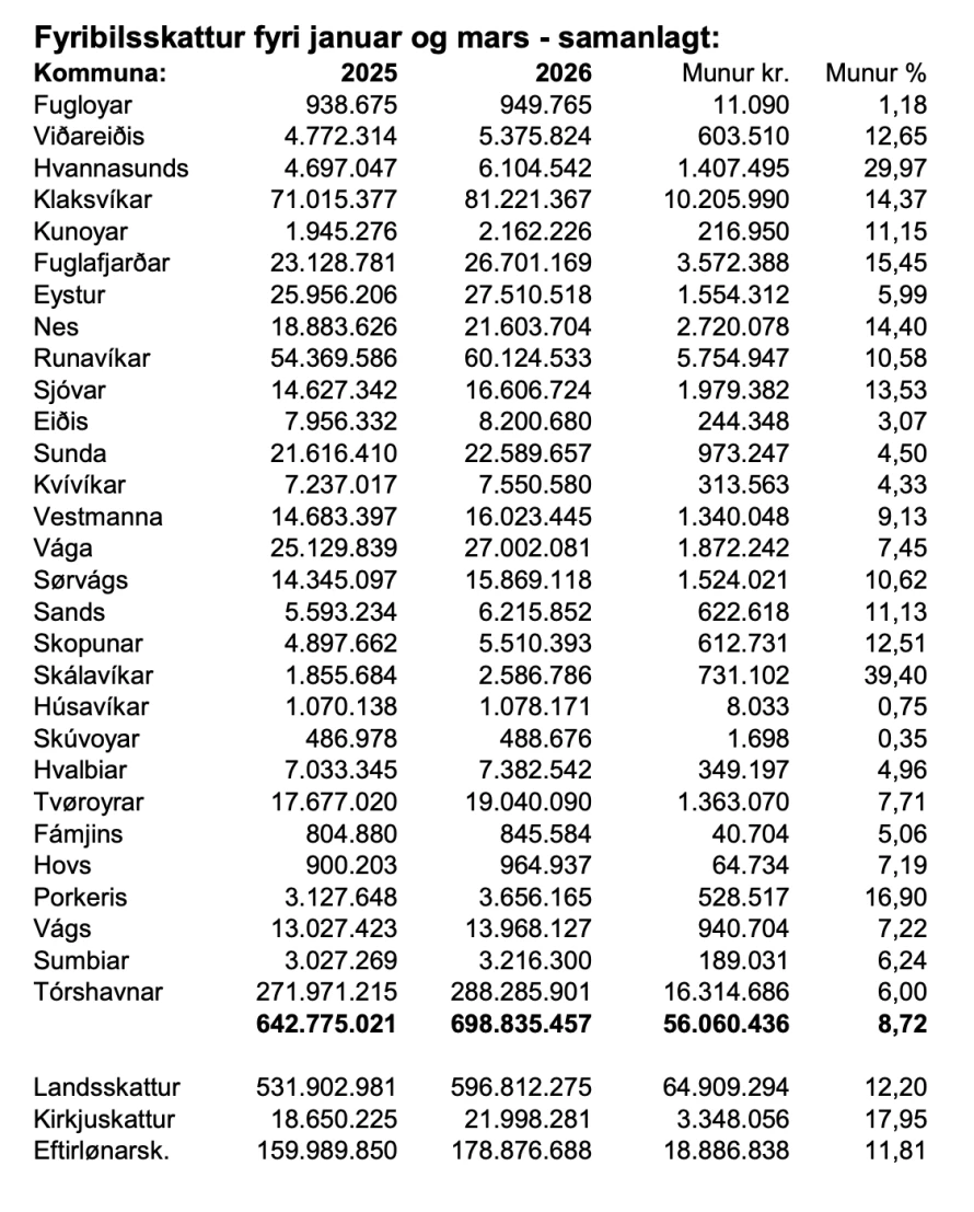 Kommunurnar fingu 56 milliónir meira inn í skatti frá 1. januar til 31. mars í ár enn sama tíðarskeið í fjør