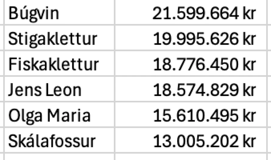 Nummar tvey var Stigaklettur, sum fiskaði fyri 20 mió. kr.