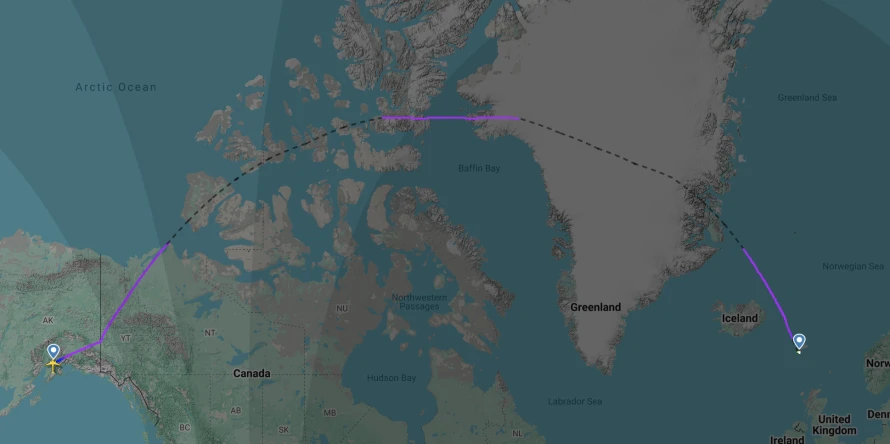 Sambært Flightradar24.com, so er teinurin úr Alaska til Føroyar umleið 6000 km, og tók túrurin útvið 8 tímar at flúgva í einum.