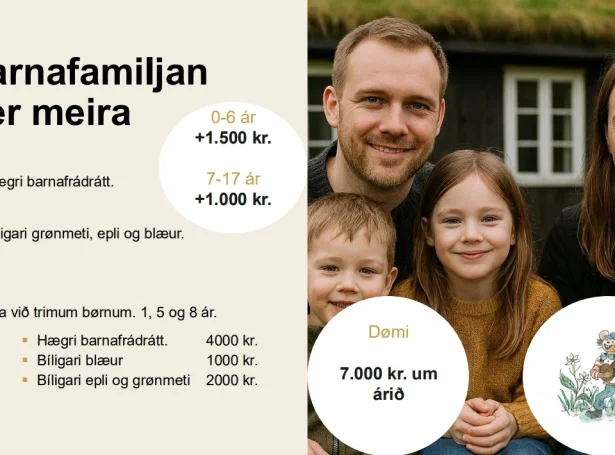 -Tað er sera týdningarmikið at skapa góðar og tryggar karmar rundan um barnafamiljurnar í Føroyum. Við at hækka barnafrádráttin og gera týdningarmiklar gerandisvørur bíligari vilja vit lætta um gerandisdagin hjá okkara yngstu borgarum og foreldrum teirra. Ein familja við trimum børnum sum eru 1, 5 og 8 ár fáa við hesum báðum uppskotinum 7.000 kr. meira at liva fyri um árið. Hetta kemur afturat skattalættanum, sum foreldrini fingu í 2024 og 2025. sigur Ruth Vang, landsstýriskvinna í fíggjarmálum.