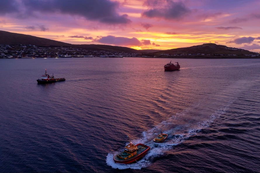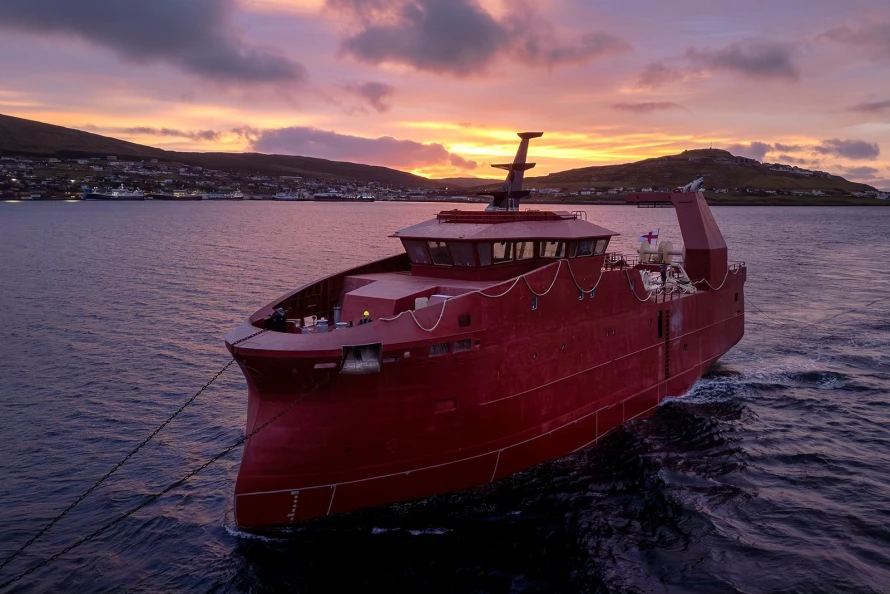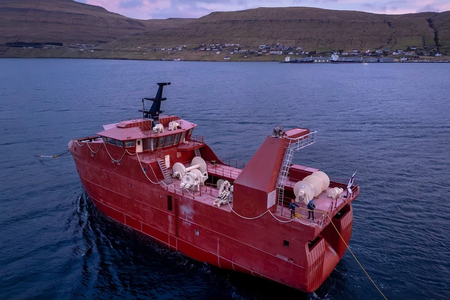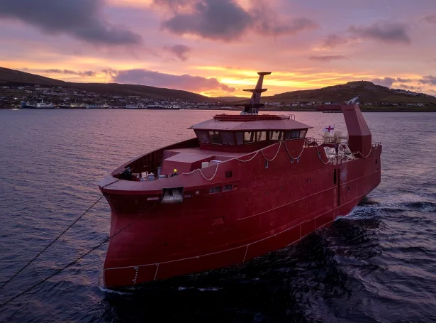 Jólaaftansmorgun kom Sleipibáturin Serval M/s á Skála við skrokkinum til nýggja frystitrolaran, sum MEST komandi summar skal lata Varðanum.