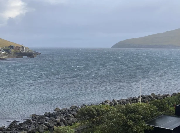 - Á Sandavágshálsi - kl. 07:19 Stívt andøvsgul, í hvirlunum upp til 27 m/s