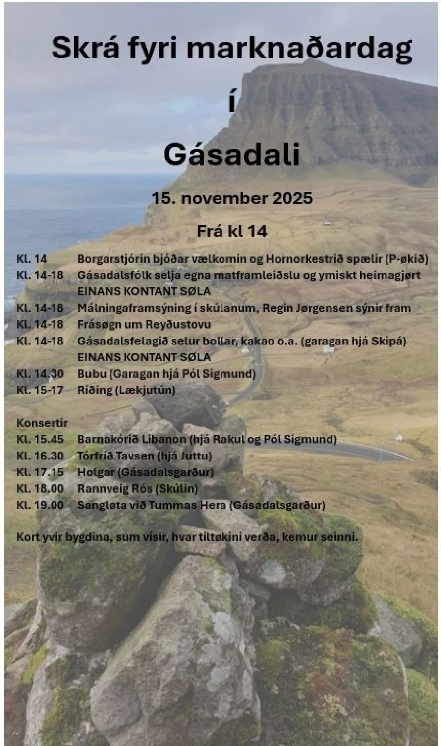 Byrjað verður kl. 14.00 við at borgarstjórin setir dagin og Sørvágs Tónleikarafelag spælir.