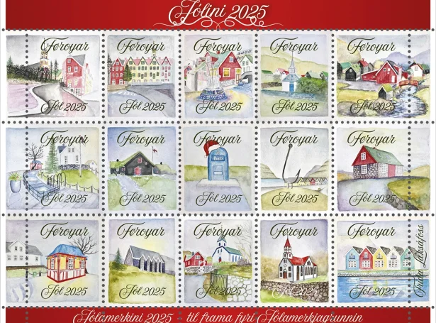 Nýggj jólamerki verða sniðgivin hvørt ár, og í ár hevur Fríða Laksáfoss sniðgivið jólamerkini, sum mynda bý- og bygarmyndir í Føroyum. Eitt ark við 15 merkjum kostar 30 krónur, og ársins jólamerki fáast til keyps á Posta og á stamps.fo frá 20. oktober, skrivar Posta.