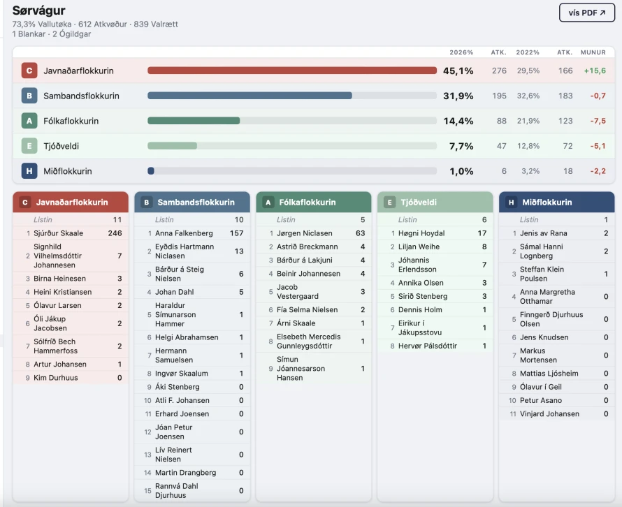 Javnaðarflokkurin fekk 45,1% í Sørvági