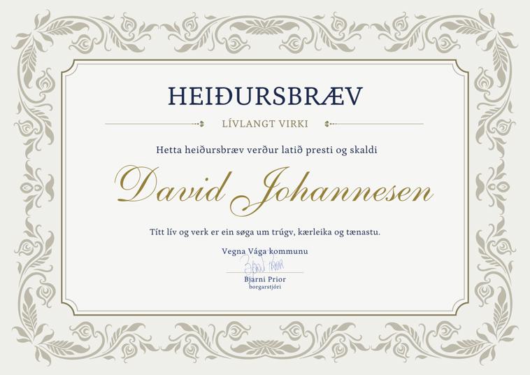Tað er við stoltleika, at Vága kommuna í dag heiðrar teg David, við hesum heiðursbrævi, sum Mentanar- og trivnaðarnevndin einmælt samtykti at lata tær sum tøkk fyri títt ótroyttiliga arbeiði sum prestur. Hetta er ein viðurkenning fyri títt stóra íkast til okkara kirkju, samfelag og mentan. Tín skaldskapur hevur ríka okkara kirkjuliði og ta føroyska málið.