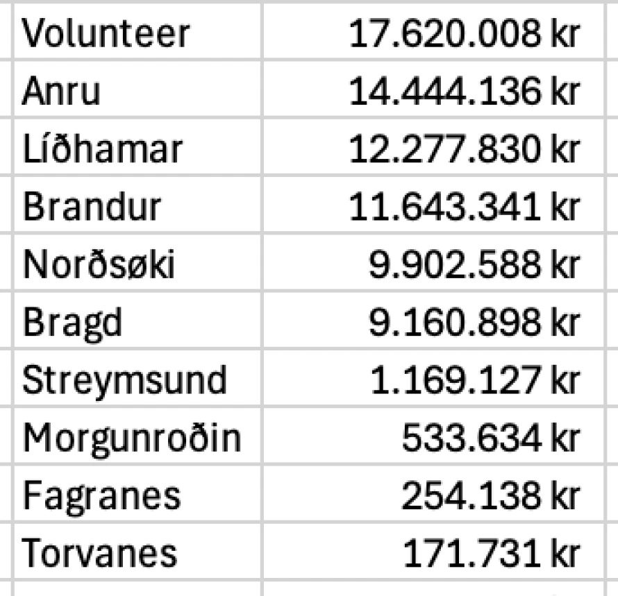 Nummar tvey var Anru, sum fiskaði fyri 14,4 mió. kr.