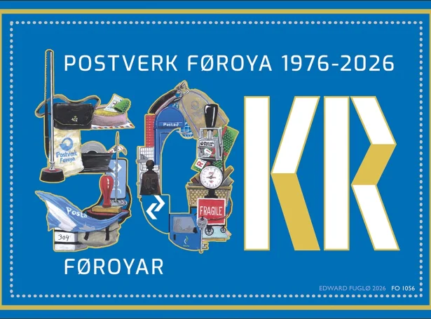 Edward Fuglø hevur sniðgivið snøgga frímerkið, sum hevur eyðkenda bláa Posta-litin, og er prýtt við gullfoliu. Hetta ger arkið til nakað serligt. Frímerkið myndar eina kollasju í skapi sum talið 50 samansett av gerandis brúkslutum, sum nýttir eru í samskiftinum við viðskiftafólk hjá stovninum ígjøgnum árini – frá fyrstu frímerkjunum í 1976 til nýmótans Posta-appina. Millum lutirnar sæst eisini tann eyðkendi hvíti rúsdrekkakassin.