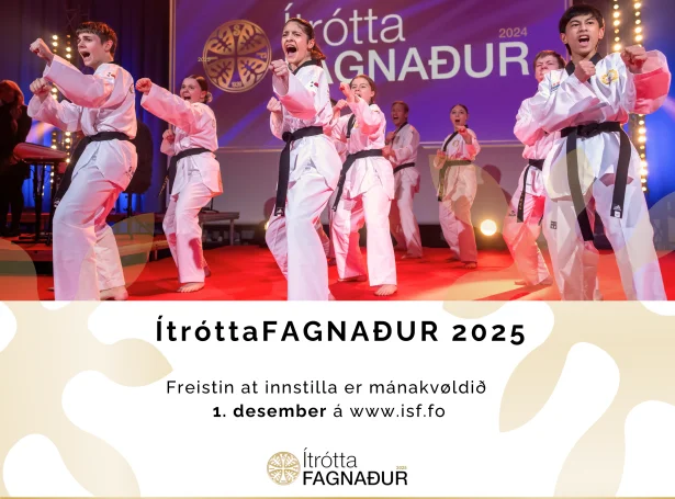 Mánakvøldið 1. desember er síðsta freist at senda uppskot til ÍtróttaFAGNAÐIN 2025. Hetta er ein áminning til allar føroyingar, ið vilja fagna ella takka einum fólki ella felagsskapi fyri teirra arbeiði og týdning fyri føroyskan ítrótt.