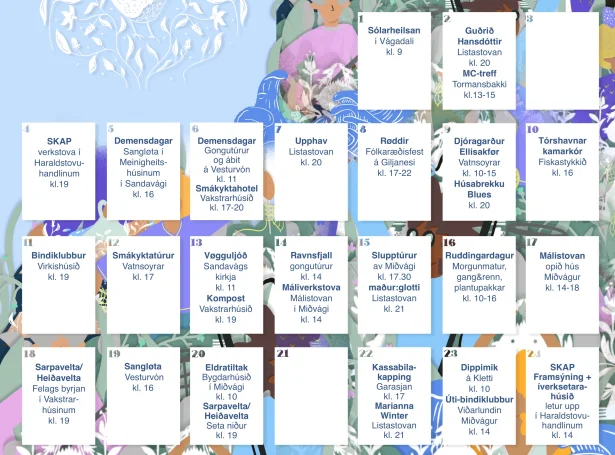 Aftur í ár verða væl umtókt tiltøk á skránni, so sum sólarheilsan, sólseturskaffi, smákyktatúrur og ein røð av konsertum. Samstundis verða nýggj átøk roynd, sum vísa á eina livandi og framfúsna kommunu – eitt nú felags velting bæði norðuri á Heiðum í Miðvági og norðuri í Sørpum í Sandavági.