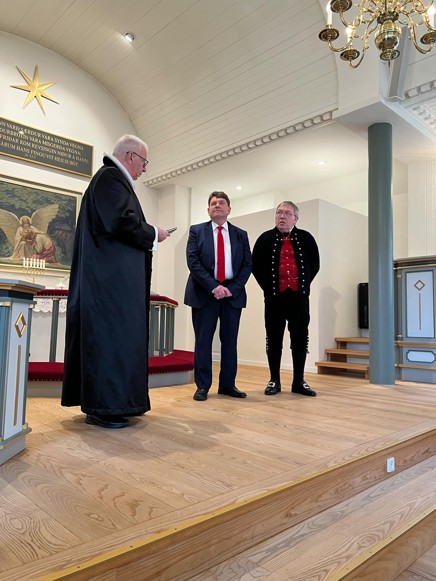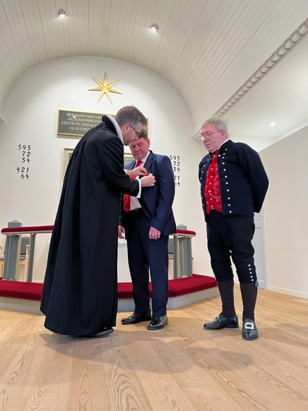 Tað er henda fatanin av heilagleika, tign og virðing, ið er karmur um løtuna, nú Jóannes Mørkøre, urguleikari, og Dánial Petur Olsen, deknur, fáa handaða tænastumedaljuna í silvuri. Hansara Hátign, Kongurin, letur tykkum hesa viðurkenning fyri drúgva og trúfasta tænastu.