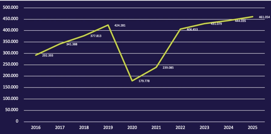 Aftur í 2025 gjørdist talan um methøgt virksemi hjá Vága Floghavn, bæði viðvíkjandi ferðafólkatali og farmi. Í árinum ferðaðust 461.054 fólk um flogvøllin, og er hetta 3,8% meira enn tey 444.035, sum fóru um flogvøllin í 2024. Eisini setti nøgdin av farmi met, tí tey góðu 8.400 tonsini, sum fóru um flogvøllin, eru umleið 16% fleiri enn tey góðu 7.200, sum fóru um flogvøllin í 2024.